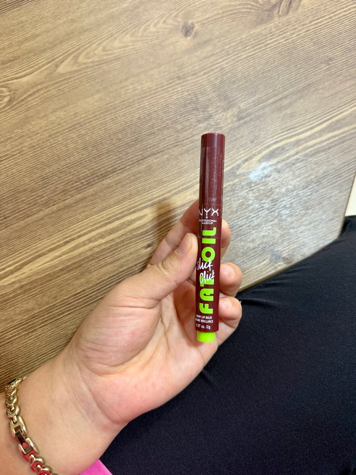NYX marka, koyu bordo renkte, parlak ve pürüzsüz bitişli lip gloss. Pratik çevirmeli tüp tasarımıyla kolay kullanım sağlar.