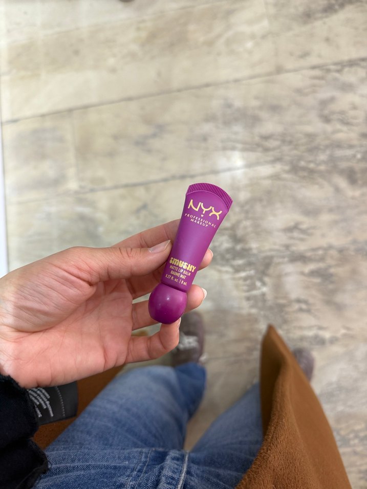 NYX markalı, parlak mor tüpte dudak bakım kremi, dudaklara nem ve parlaklık sağlar .
