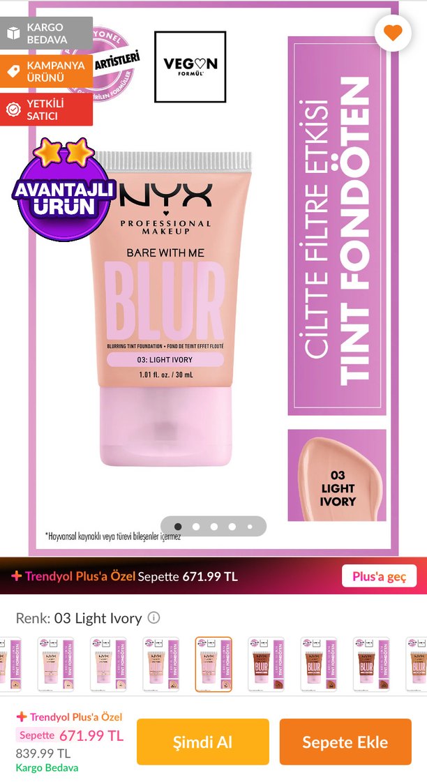 Yeni gibi (NYX Bare With Me Blur BB krem 03 Light Ivory, pastel bej tonuyla cilt tonunu eşitler ve bulanıklaştırıcı filtre etkisi sağlar. Yumuşak ve kolay uygulanabilir formüle sahiptir. ✨)