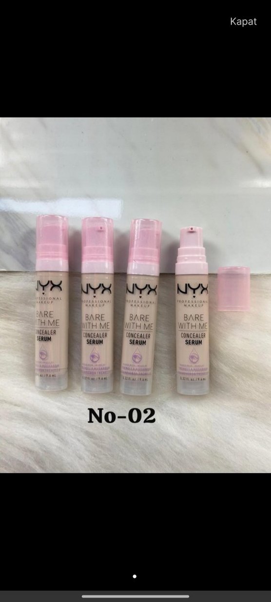 NYX Bare With Me kapatıcı serumu No-02 bej tonunda, pastel renkli ve kolay uygulanabilen pompalı şişede sunuluyor.