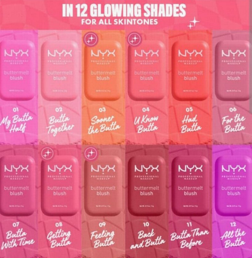 NYX Buttermelt allık, tüm cilt tonlarına uygun 12 parlak ton sunar. Açık pembe tonu ile yumuşak ve ışıltılı bir görünüm sağlar.