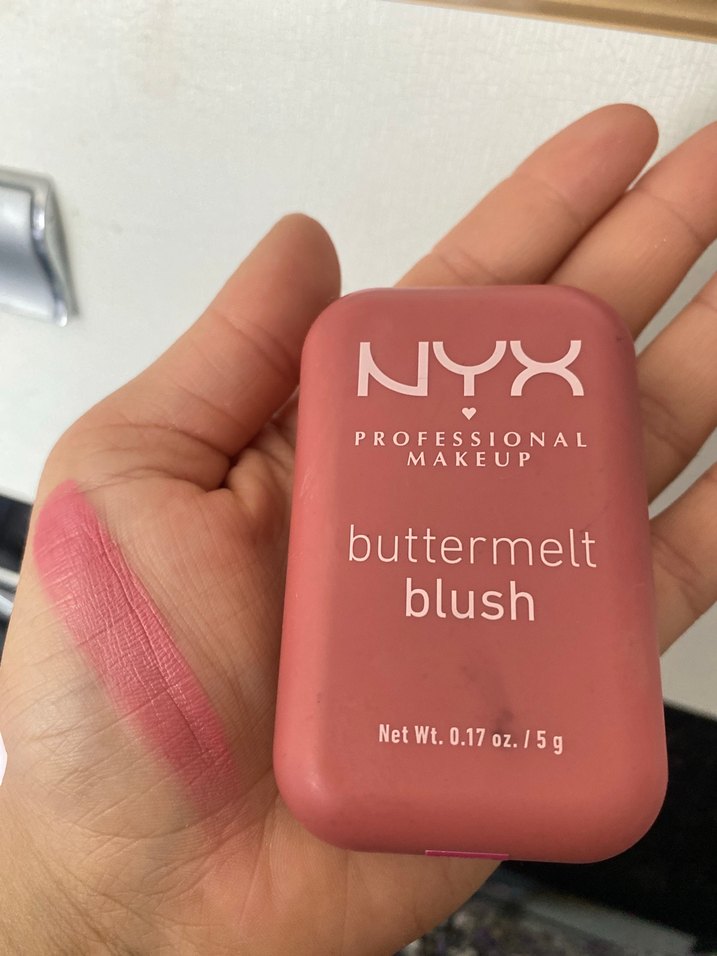 Nyx Buttermelt allık, pastel pembe tonunda ve yumuşak dokuludur. 5g ürün içerir ve kompakt kutudadır.