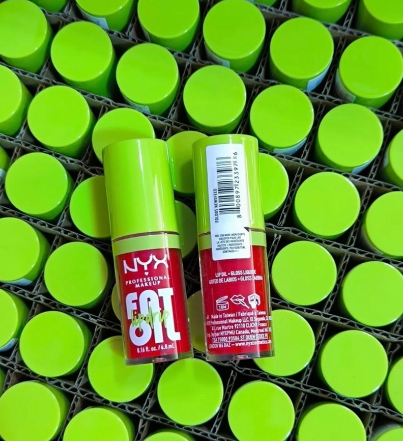 NYX lip gloss, canlı haki renkte, parlak bitişli. Parlak yeşil kapak ve net etiketlemeye sahip.