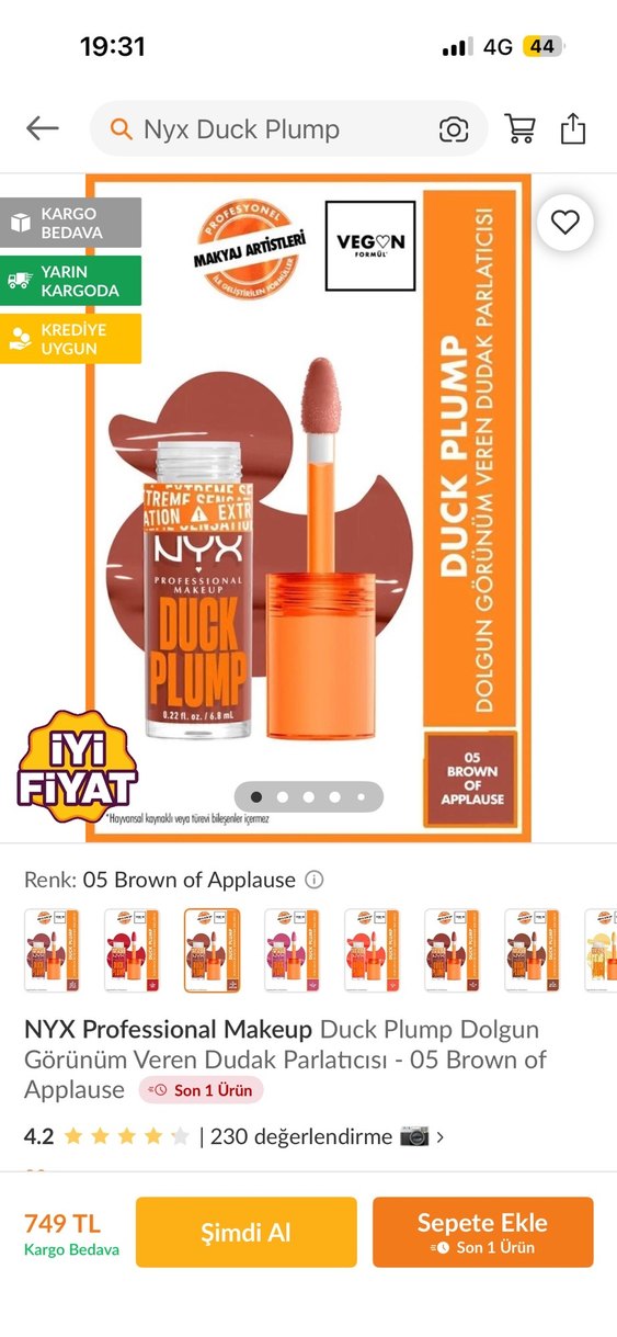NYX Professional Makeup Duck Plump dudak parlatıcısı 05 Brown of Applause koyu bej tonunda, dolgun görünüm veren vegan formüle sahip.