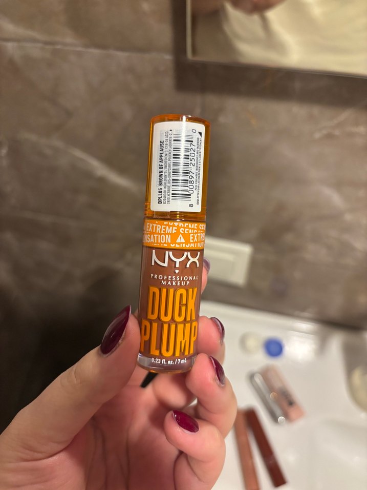 NYX Duck Plump 05 rengi. Sadece bir kere denemek için kullandım, dudaklarımı yakmasını sevmedim ve bi daha hiç kullanmadım, tertemizdir.