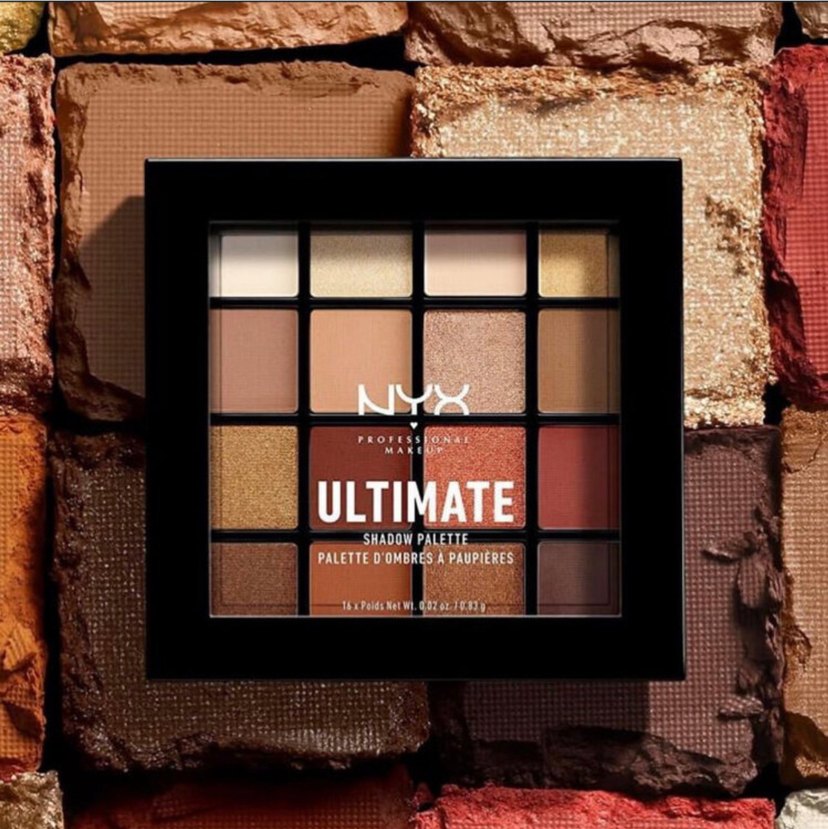 NYX Ultimate göz farı paleti, bej ve koyu tonlarda 16 renkten oluşur, çeşitli göz makyajları için uygundur.