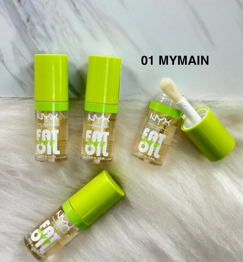 NYX Fat Oil lip gloss, açık haki 01MYMAIN renginde, parlak ve yumuşak dokulu. Uygulaması kolay aplikatör ile birlikte.
