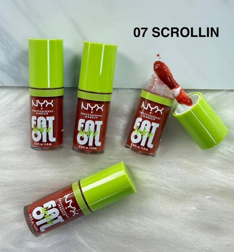 NYX 07 Scroll renkli dudak parlatıcısı, canlı ve parlak bir görünüm sunar. Ambalaj üzerinde ürün adı okunabilir.