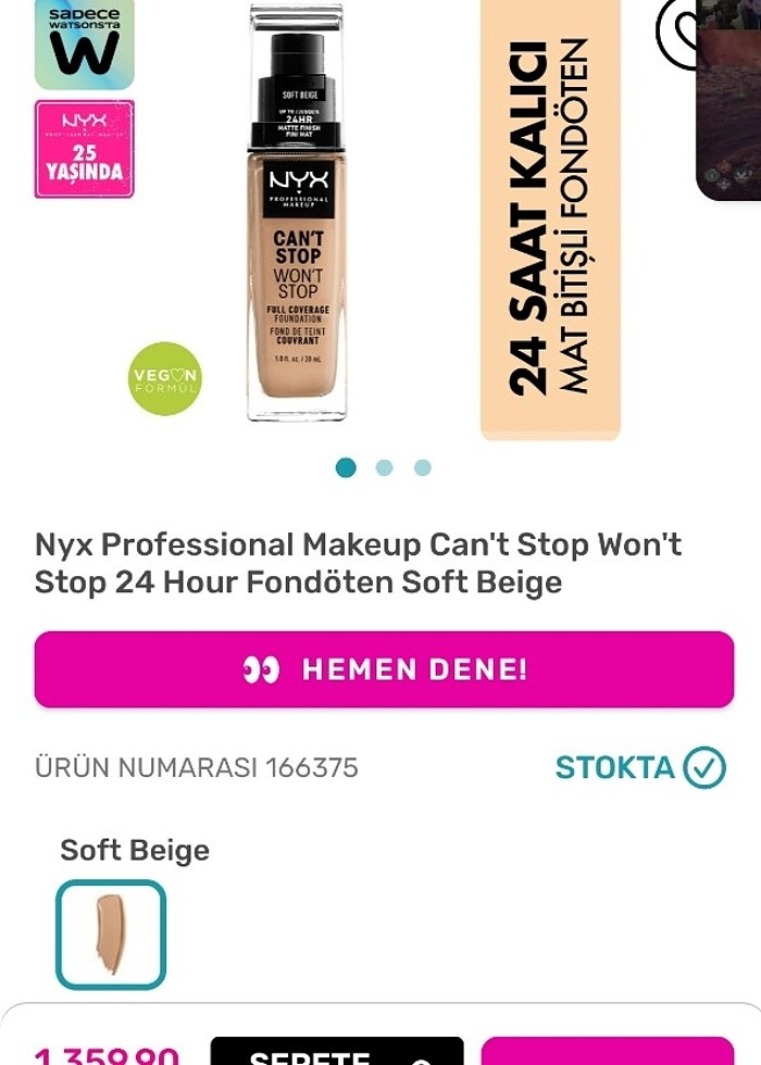 Nyx fondoten beige hiç açmadım iki tane almışdım ne olur ne olmaz diye bana çok koyuydu bu iki aydır çekmecemde duruyor hiç açılmadı barkodu üstünde