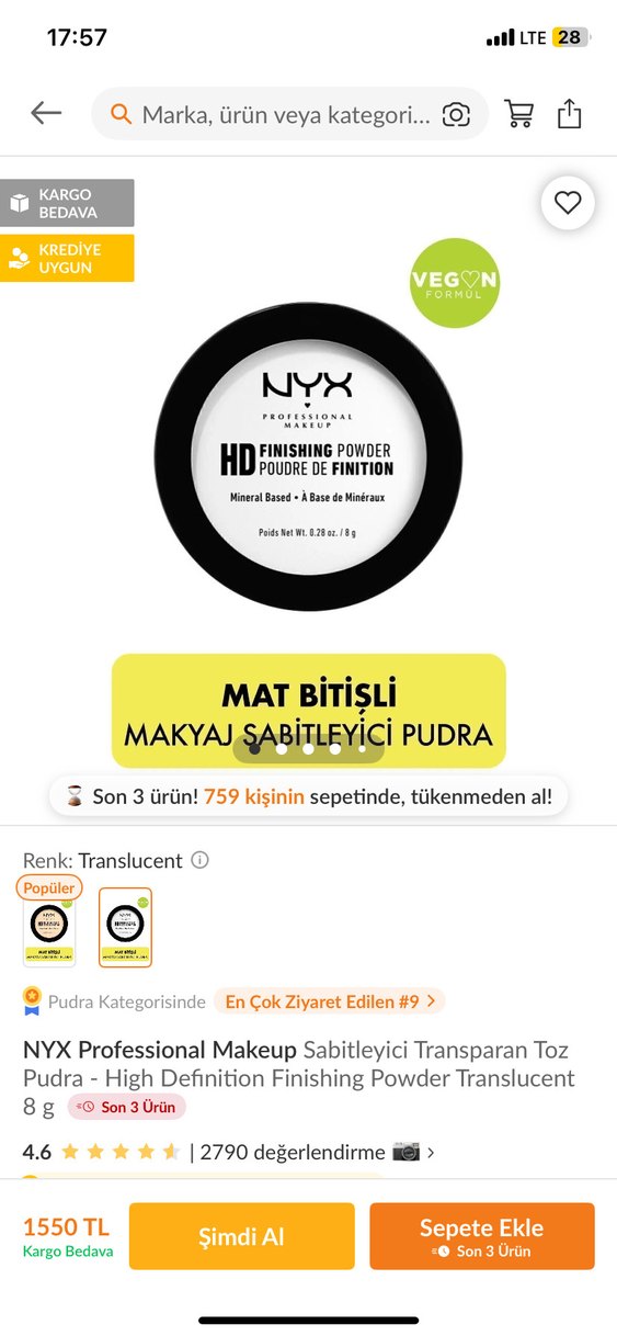 Hiç kullanılmadı NYX HD Bitirici Pudra, parlak bej rengiyle makyajınızı mineral bazlı olarak sabitler ve pürüzsüz bir görünüm sağlar. ✨