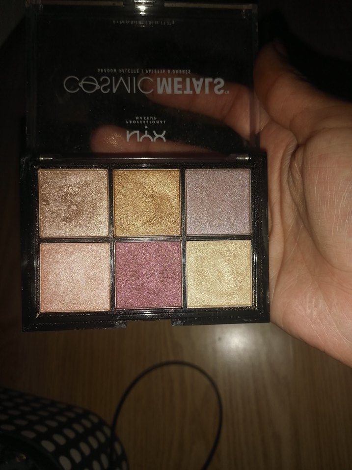 NYX Kozmik Metalik göz farı paleti, bej, altın ve pembe tonlarında altı hafif, parlak renkten oluşur.