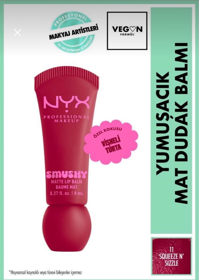 NYX Smushy Mat Dudak Balmı, yumuşak dokulu ve vişneli turta kokulu pastel pembe renkte. Vegan formüllü, 8 ml.