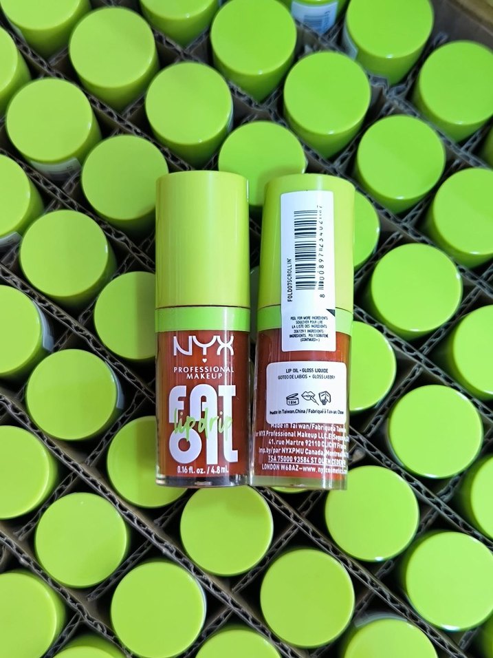 NYX Fat Oil lip gloss, parlak haki rengiyle canlı ve parlak bir görünüm sunar.