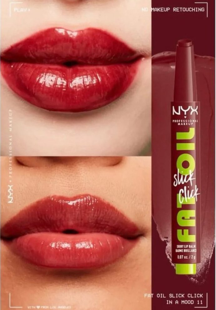 NYX parlak kırmızı tonunda, yağ bazlı formülüyle pürüzsüz ve parlak bir lip gloss. Oil Slick Click canlı renk ve nem sağlar.