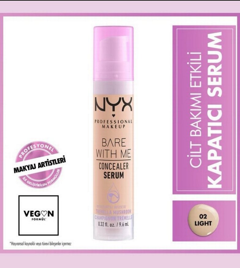 NYX Profesyonel Makyaj kapatıcı serumu, 02 Light pastel bej tonunda cilt bakım etkisi sunar. Vegan formüllü, mantar özü içerir.