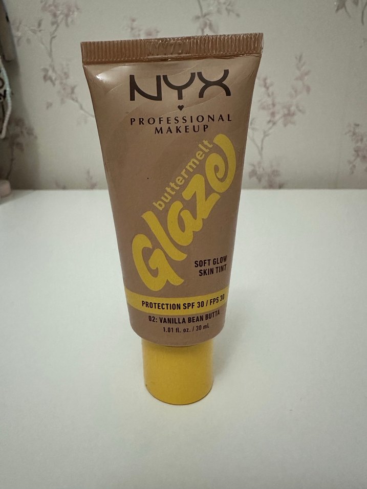 NYX Profesyonel markasına ait buttermelt glaze skin tint’i, pastel bej renginde, SPF 30 korumalı yumuşak ışıltılı kapatma sağlar. ✨ esmer ve buğday tenlilere uygun olacağını düşünüyorum. Ürün orjinaldir, ambalajı hiç açılmadı (yani hava değmedi). Hiç kullanılmamıştır.