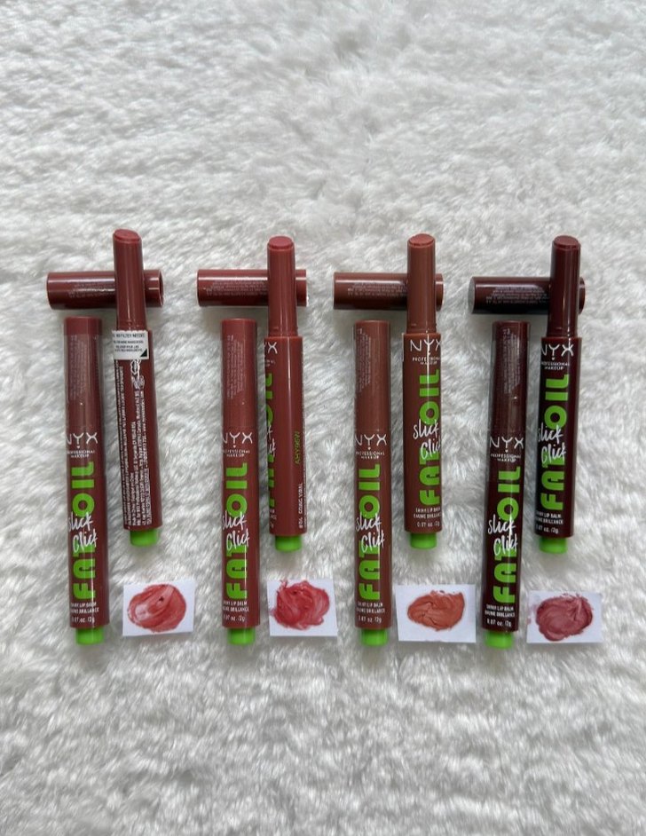 NYX renkli dudak parlatıcısı seti, bej tonlarında parlak ve pürüzsüz bir görünüm sunar. Her parlatıcının yanında renk örneği bulunur.