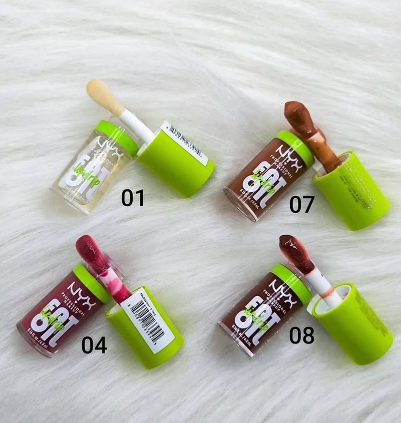 NYX lip gloss seti, haki ve diğer renklerde dört canlı renkten oluşur. Her tüp, kolay uygulama için pratik aplikatöre sahiptir.