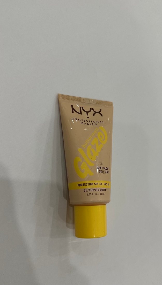 NYX sarı parlak fondöten, SPF 30 korumalı ve 01 Whipped Butta tonunda yumuşak ışıltılı cilt tonu sağlar.
