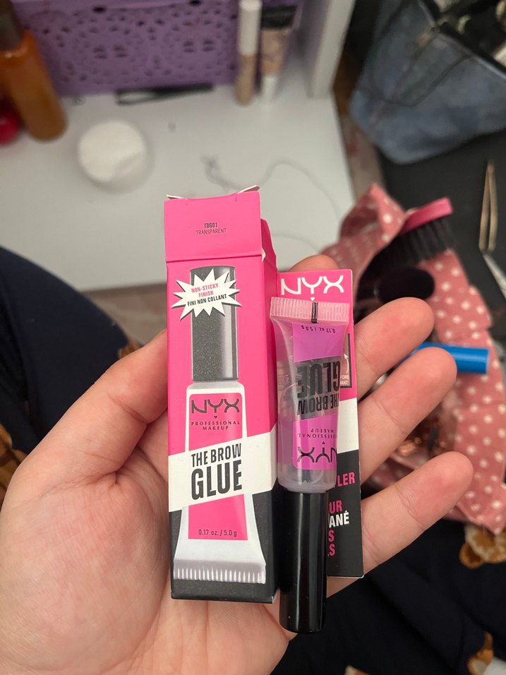 NYX The Brow Glue koyu pembe renkli, kaş ve kirpikler için güçlü tutuş sağlar. Küçük tüp içinde aplikatörlü, makyaj sabitlemek için uygundur.