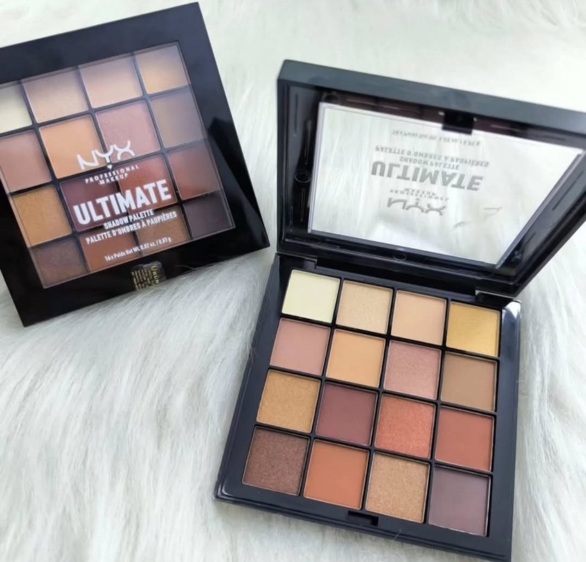 NYX Ultimate göz farı paleti, mat ve ışıltılı bitişlere sahip 16 adet bej ve koyu ton içerir. Çok yönlü makyaj için uygundur.