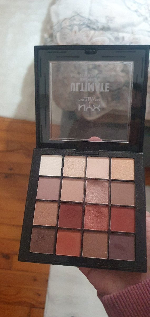 NYX Ultimate göz farı paleti, mat ve ışıltılı karışık 16 koyu bej tonunda renk içerir, çeşitli makyaj stilleri için uygundur.