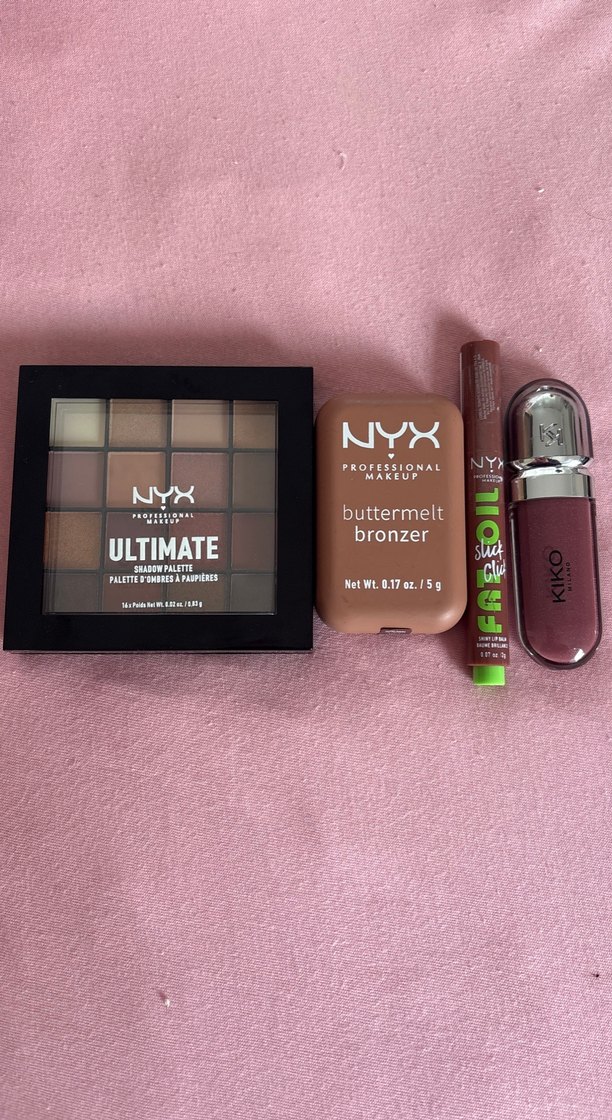 NYX Ultimate göz farı paleti, buttermelt bronzer, ince eyeliner ve koyu dudak rengi içeren set. Canlı göz ve yüz makyajı için uygun.