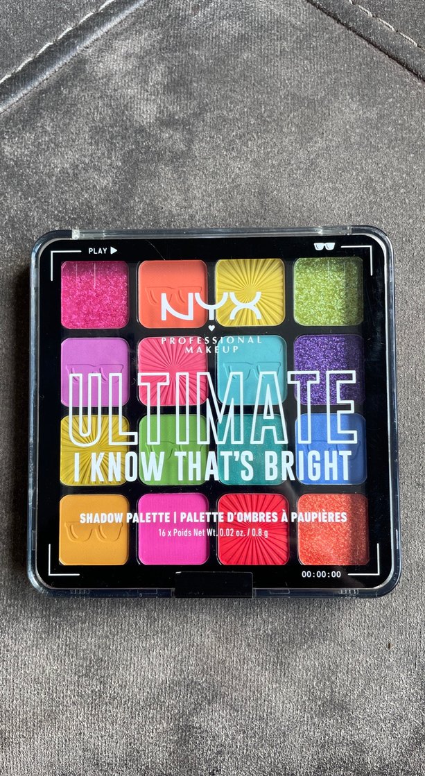 NYX Ultimate I Know That's Bright far paleti, 16 canlı ve parlak renkten oluşur, kompakt kutuda sunulur.