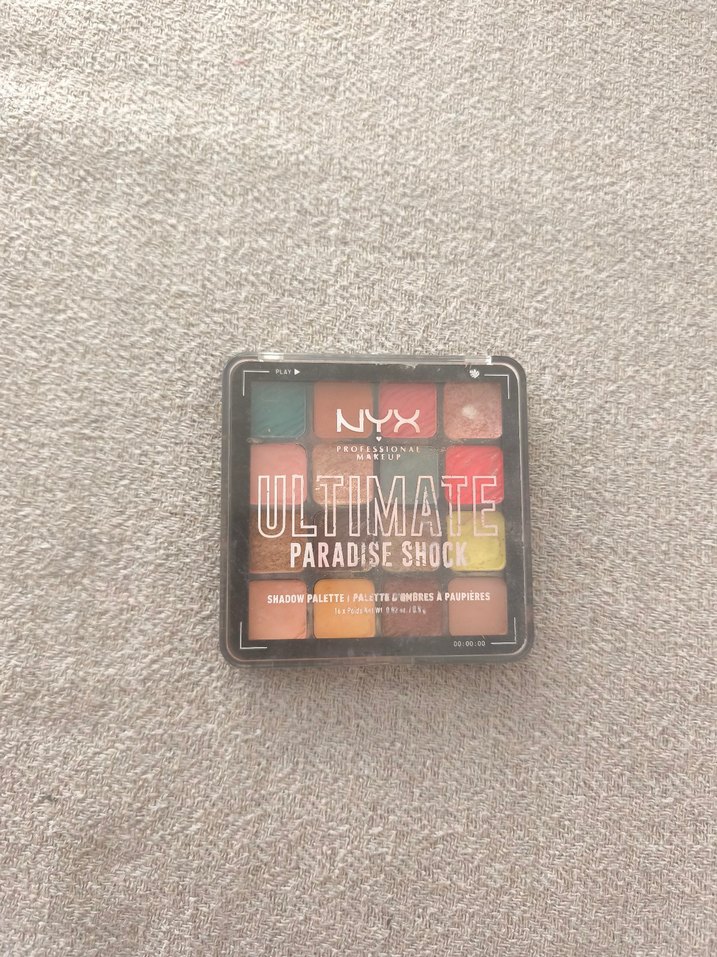 Az Kullanılmış. NYX Ultimate Paradise Shock göz farı paleti, koyu ve canlı çok renkli tonlar sunar, kompakt kutuda yer alır.
