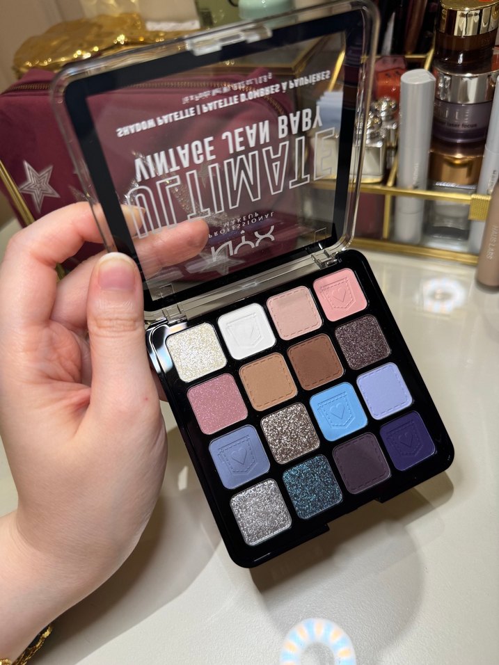 NYX Ultimate Vintage Jean Baby göz farı paleti, yumuşak pastellerden koyu canlı renklere kadar 16 çok renkli ton içerir, ışıltılı ve mat dokularla.