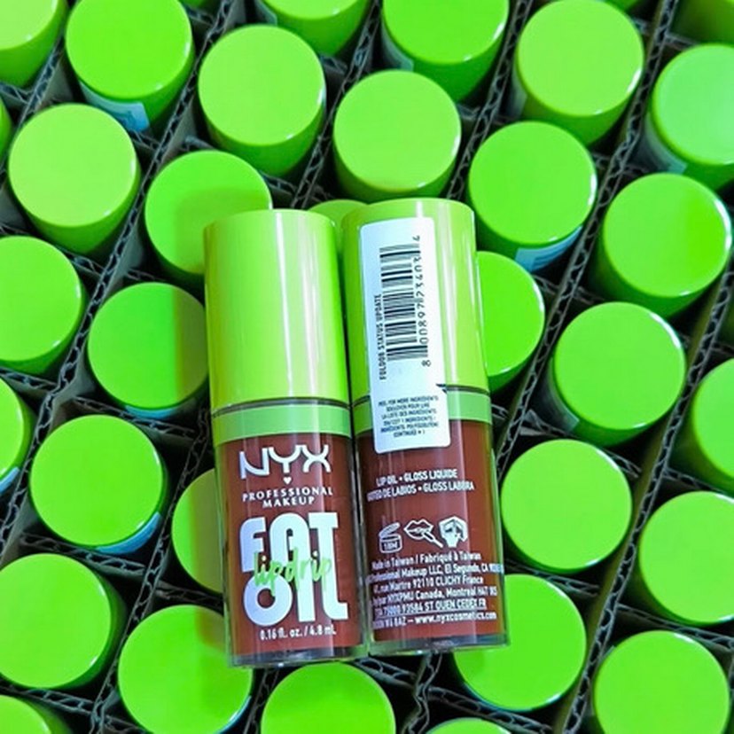 NYX Fat Lip Oil lip gloss, koyu haki renkte, parlak ve pürüzsüz bir görünüm sağlar. Yeşil kapaklı küçük tüpte.