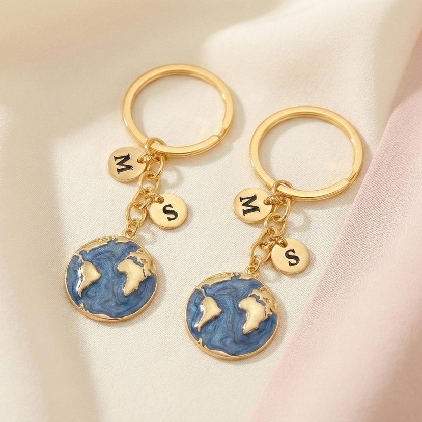 O benim dünyam Altın Renkli Dünya Desenli Çift Anahtarlık
