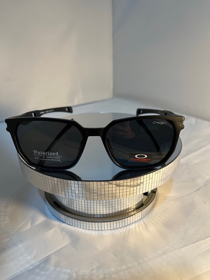 Oakley markasının siyah çerçeve ve gri polarize camlı erkek güneş gözlüğü, klasik ve çağdaş sokak stilini yansıtıyor.️