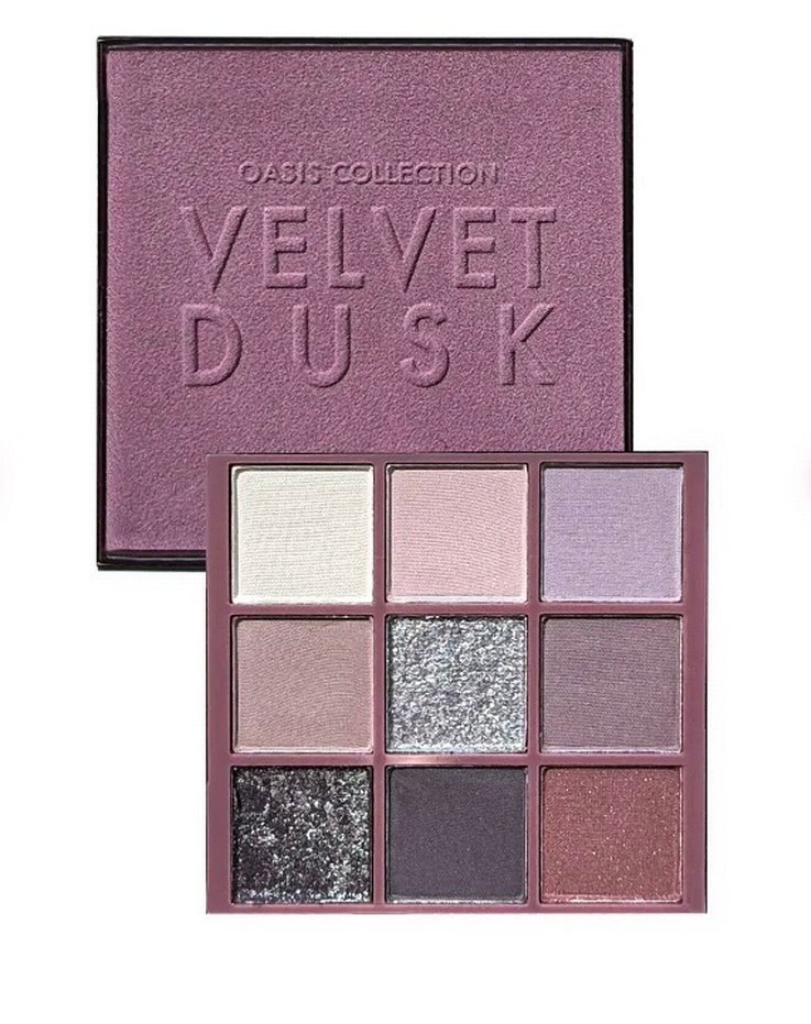 Mor tonlarda dokuz renkli göz farı paleti. Mat ve ışıltılı seçeneklerle çeşitli makyajlar yapabilirsiniz. Üzerinde "VELVET DUSK" yazmaktadır.