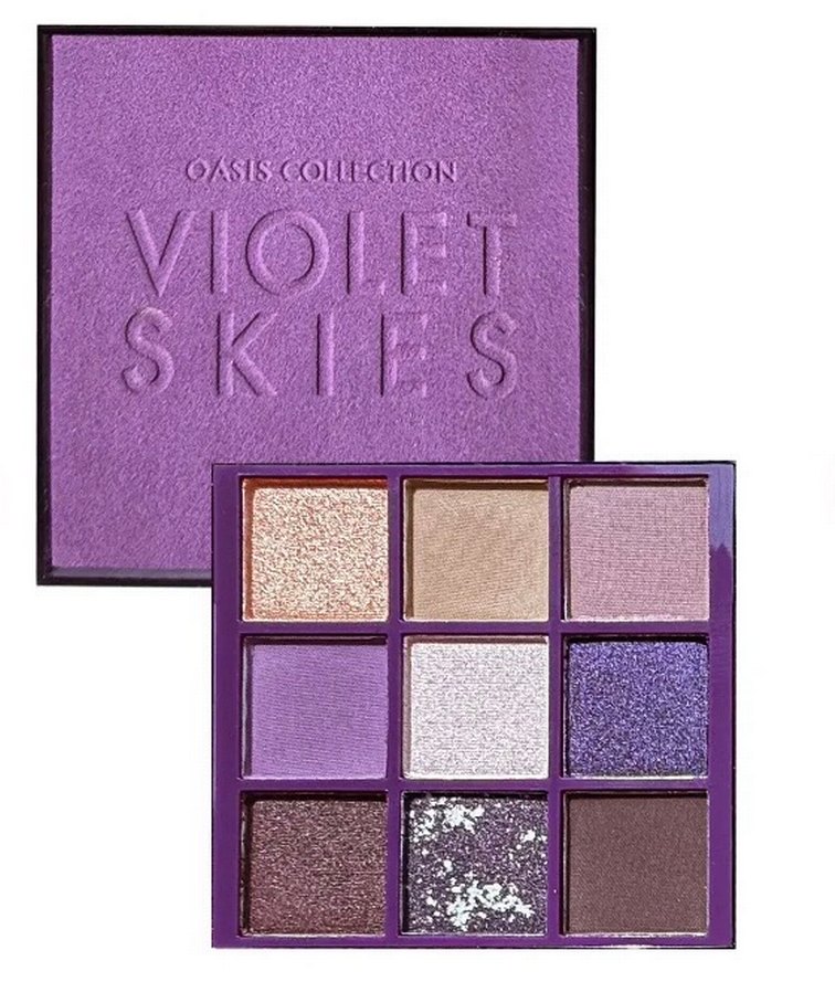 Oasis Collection Violet Skies göz farı paleti, mat ve ışıltılı dokularda koyu mor tonlarında dokuz renk içerir.