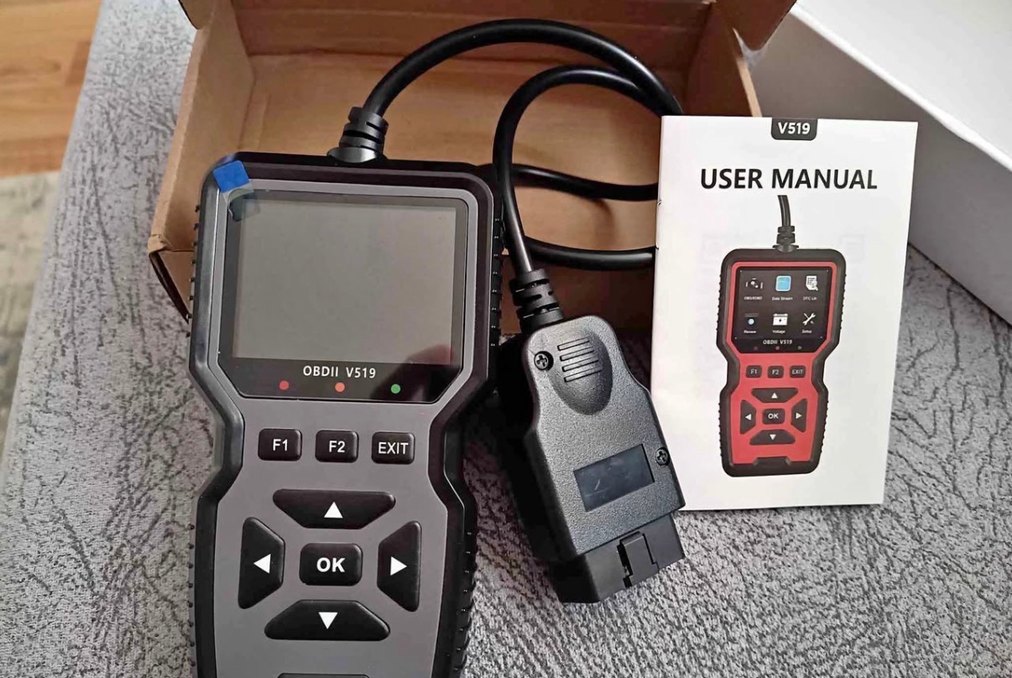 Gri renkte OBDII V519 cihazı, ekran ve fonksiyon tuşlarıyla araç arıza tespiti yapar. Araç bağlantısı için kablo ile birlikte gelir.
