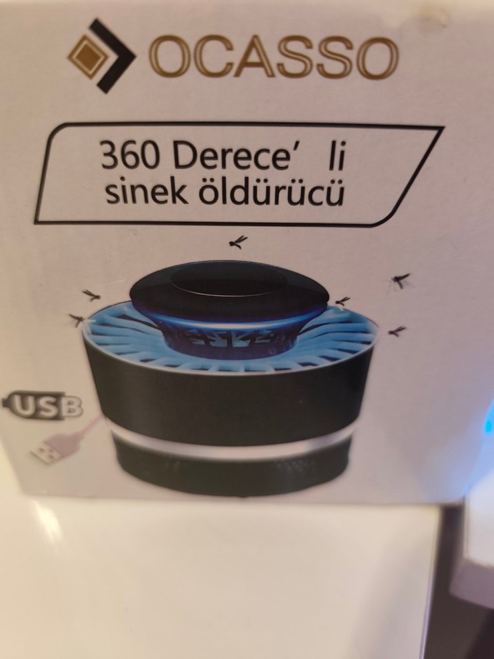 OCASSO markalı, USB bağlantılı, 360 derece sinek öldürücü fonksiyonlu siyah cihaz.