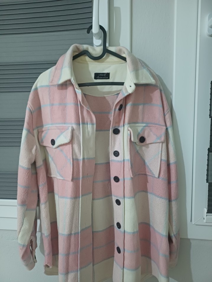 Pembe tonlarında baklava desenli, uzun kollu, düğmeli, notched lapel yakalı ve yumuşak sıcak kumaştan üretilmiş bol kesim kadın gömlek.