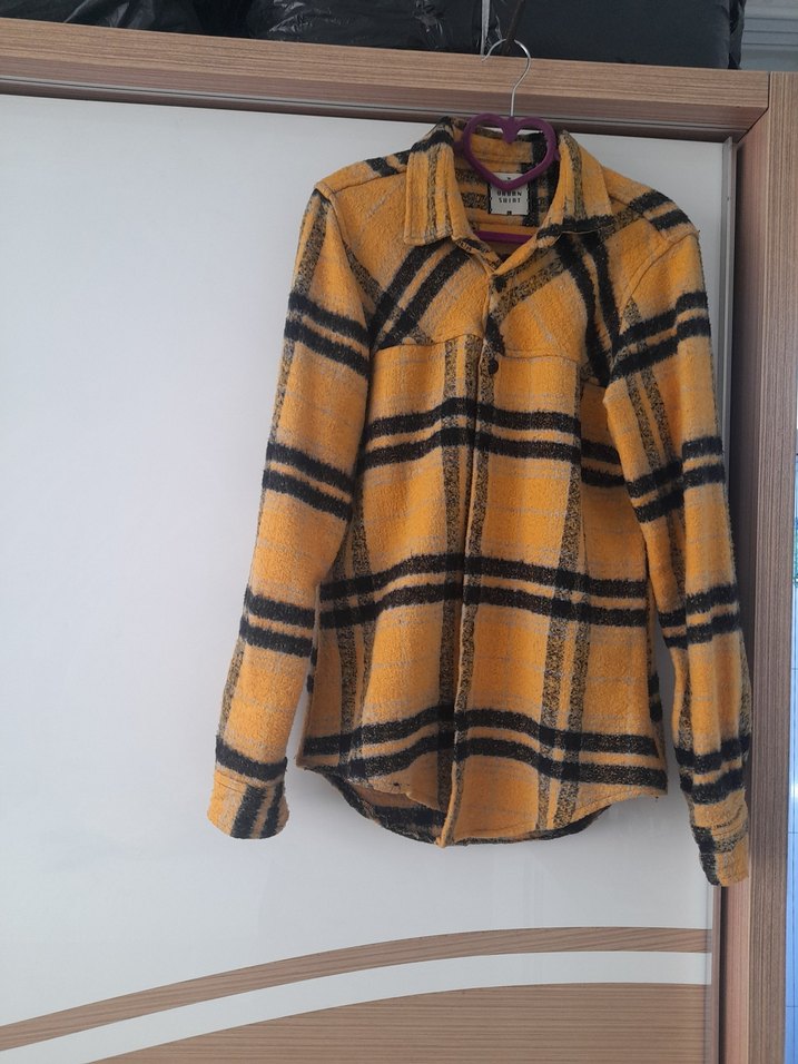 Sarı ekose desenli, yumuşak yün kumaştan, uzun kollu ve düğmeli, yakalı gömlek. Rahat ve sıcak sokak stili için uygundur. sayılı 2 kere giyilmiştir iki koltuk arası 52 cm dir