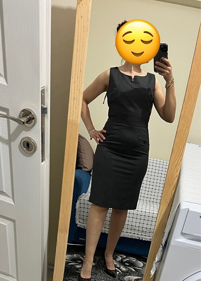 Füme rengi ofis elbisesidir. 105 basen 75 bel 84 göğüs ve 158 cm boyda 57 kilo olarak giydim bana basenlerden dar geliyor. Göbek de olduğu için rahatsız edici bir görüntü verdi ama 52-53 kilo birine ya da baseni 90-95 arası olan birine daha hoş duracaktır.
