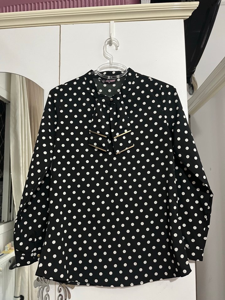 Siyah uzun kollu, beyaz puantiyeli, düğmeli V yaka gömlek. Salaş kesimiyle ofis ve günlük kullanıma uygundur.