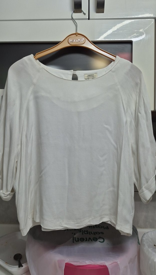 Beyaz keten kumaştan, kısa kollu ve yuvarlak yakalı, rahat kesim kadın bluz. Günlük kullanıma uygun, sade ve şık görünüme sahiptir.