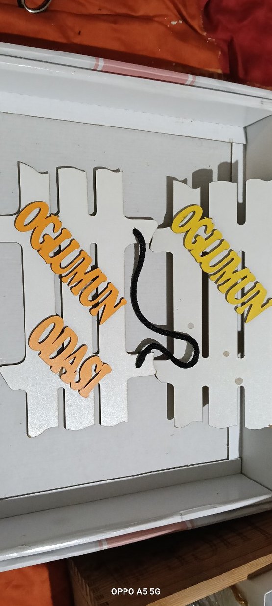 Gri ve beyaz renkte, "OĞLUMUN ODASI" yazılı KAPİ SUSU Canlı sarı ve turuncu yazılarla sokak stili ve öncü modayı yansıtıyor. ️