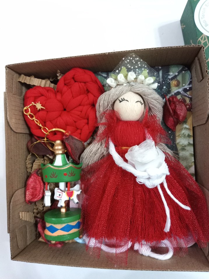 Kırmızı elbiseli, tacı ve beyaz çiçeği olan renkli bebek. Kalp şeklinde aksesuar ve atlı karınca figürlü küçük kırmızı yeşil atlı karınca ile birlikte. kış görseli simli kartpostal özel günlerinize güzel bir hediye