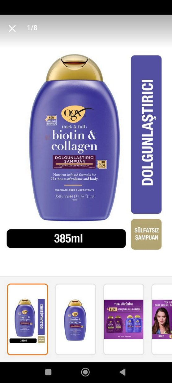 OGX Biotin & Collagen saç şampuanı, saçları kalınlaştırmak ve dolgunlaştırmak için kolajen ve biotin içerir. Sülfatsız formül, 385ml.