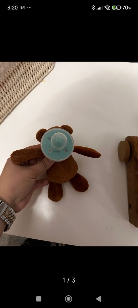 Pastel kahverengi emzik, yumuşak ve yuvarlak silikon emziğe sahip, kahverengi peluş ayıcıkla birlikte rahatlık ve oyun sağlar.