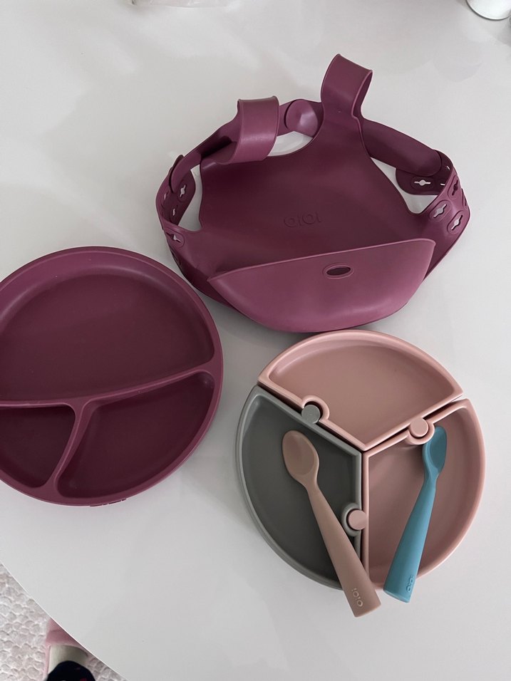 Bordo renkte bölmeli çocuk tabağı, cep önlük ve yumuşak renklerde kaşık ile çatal seti içerir. Hiç bir deformesi yoktur. Ayrı da satın alım yapılabilir