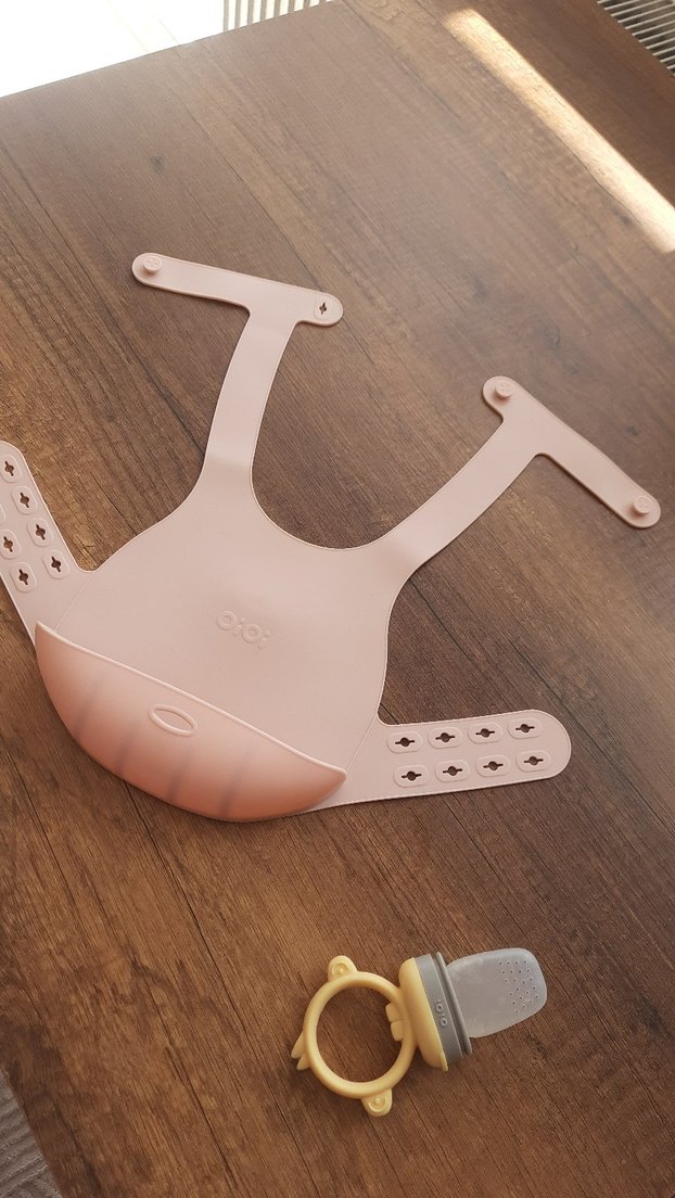 Ayarlanabilir kayışlı ve döküntüleri yakalayan cepli bej silikon bebek önlüğü. Yumuşak ve kolay temizlenir.