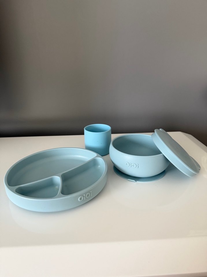 Oioi marka, Mavi renkli bölmeli tabak, kapaklı kase ve bardaktan oluşan çocuk yemek seti.