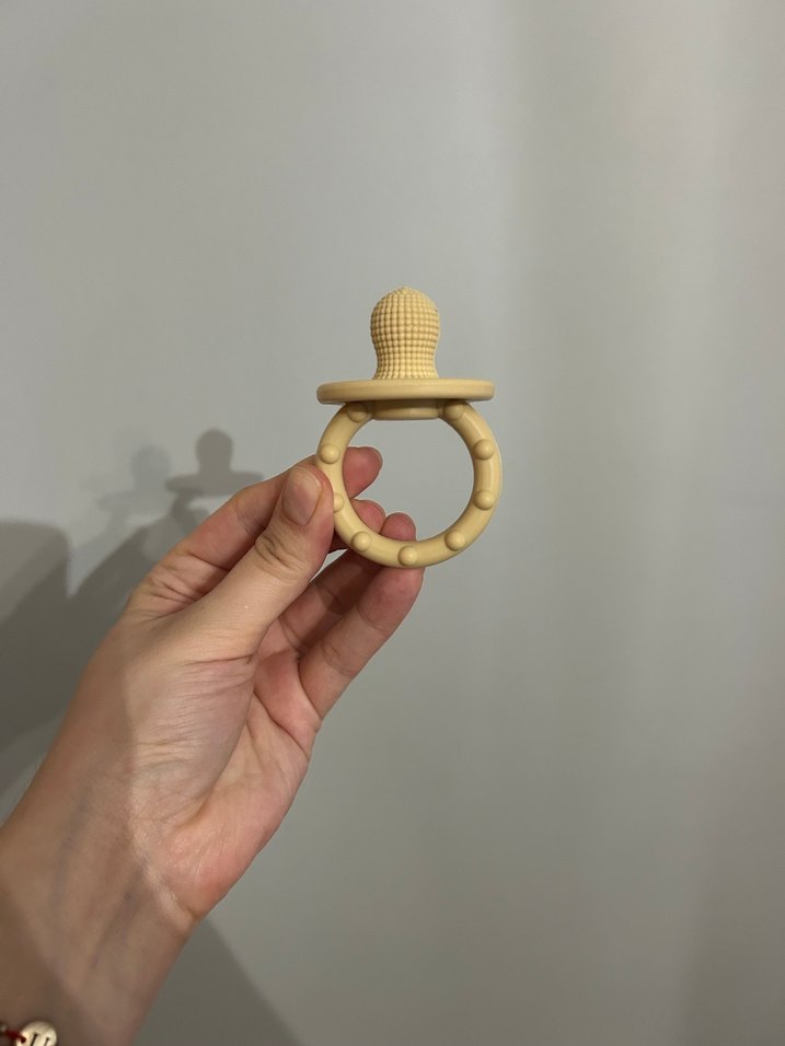 Bej renkli silikon emzik, yumuşak uçlu ve dokulu halka saplıdır. Pastel tonu ile bebekler için sakin bir görünüm sunar.